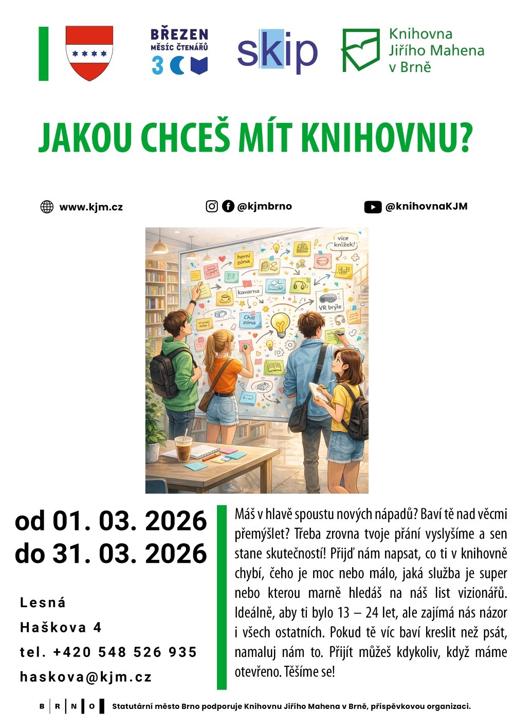 Máš v hlavě spoustu nových nápadů? Baví tě nad věcmi přemýšlet? Třeba zrovna tvoje přání vyslyšíme a sen stane skutečností! Přijď nám napsat, co ti v knihovně chybí, čeho je moc nebo málo, jaká služba je super nebo kterou marně hledáš na náš list vizionářů. Ideálně, aby ti bylo 13–24 let, ale zajímá nás názor i všech ostatních. Pokud tě víc baví kreslit než psát, namaluj nám to. Přijít můžeš kdykoliv, když máme otevřeno. Těšíme se!