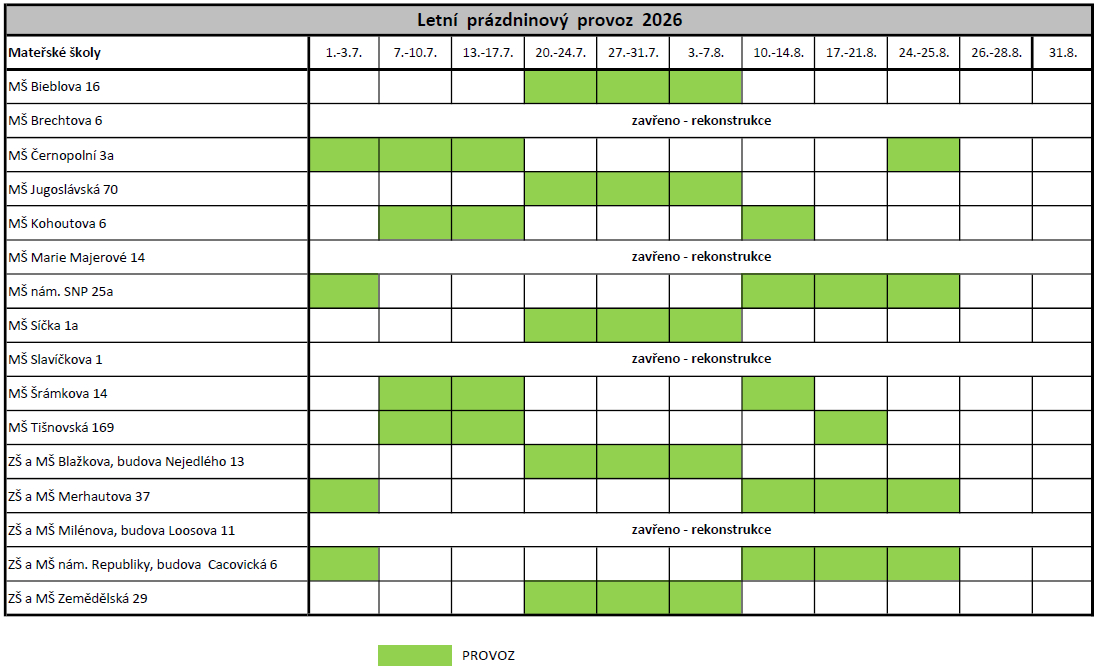 - Tabulka letního prázdninového provozu mateřských škol v roce 2026 (PDF, 413 kB)