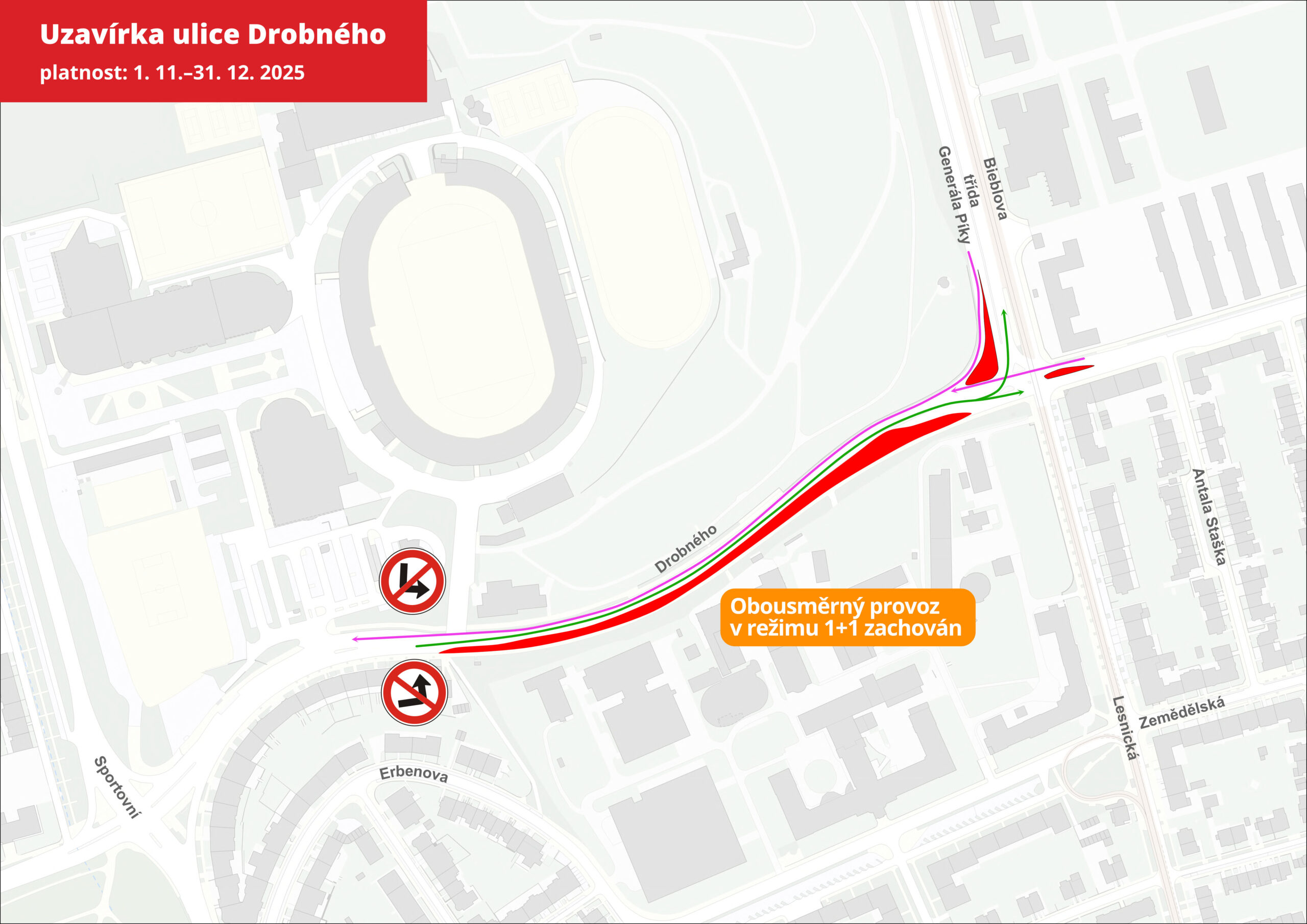 - Ulice Drobného bude v daném úseku oboustranně průjezdná.