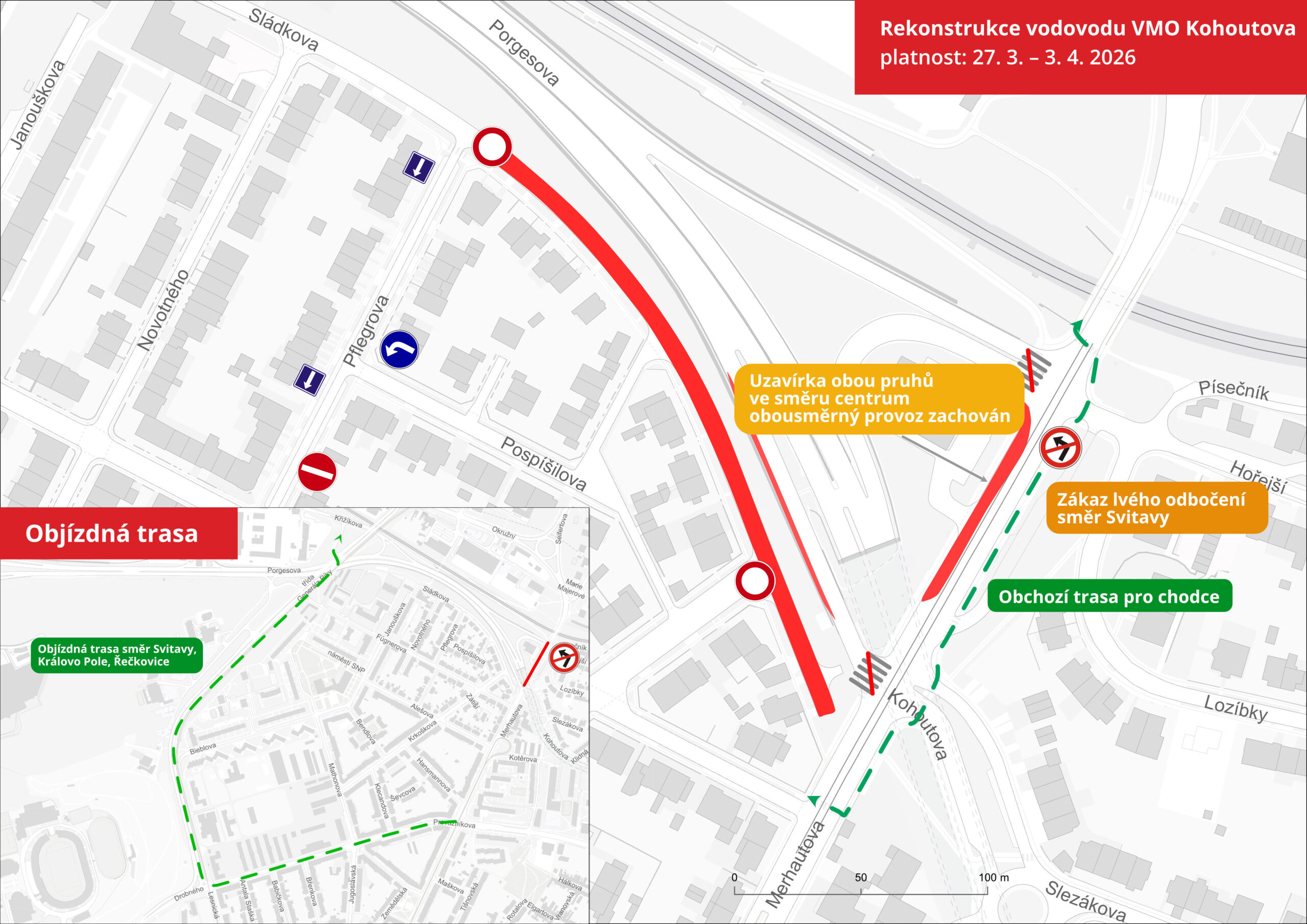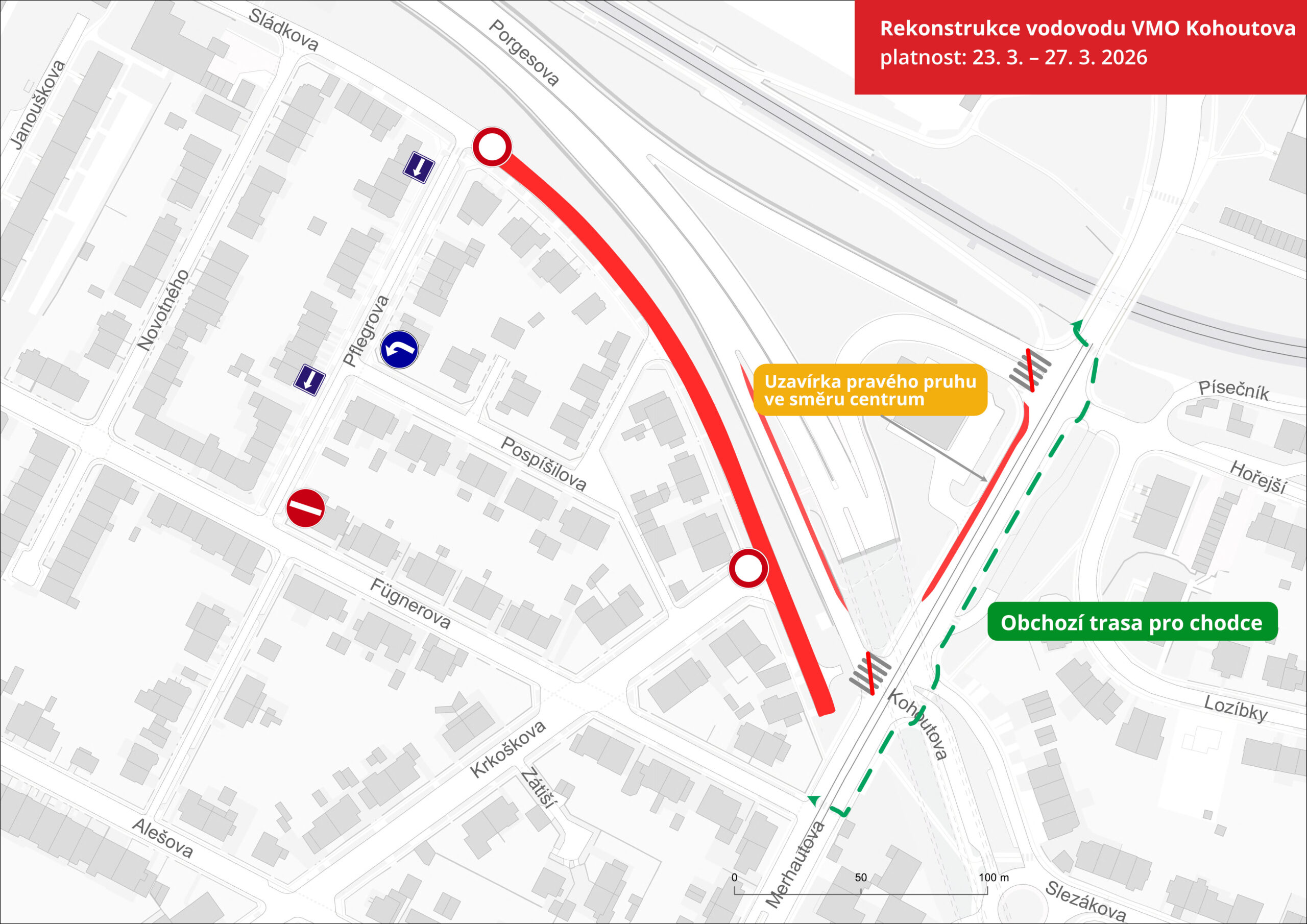 - Chodník a přechody pro chodce mezi rampami z Porgesovy na Merhautově na pravé straně ve směru do centra se uzavřou. Obchozí trasa vede po druhé straně ulice.